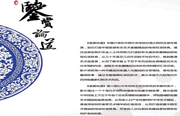 “鉴赏论道经典艺术精品鉴赏回顾展”的主题序列为:突出展示中国传统文化古典艺术文化精髓类别──瓷器、玉器、金银器、杂项钱币、书画(书画可含近、现、当代);所示类别展品来源进行征集,并作为《鉴赏论道》影片后期拍摄素材;同时甄选海内外知名中国传统文化艺术收藏家。